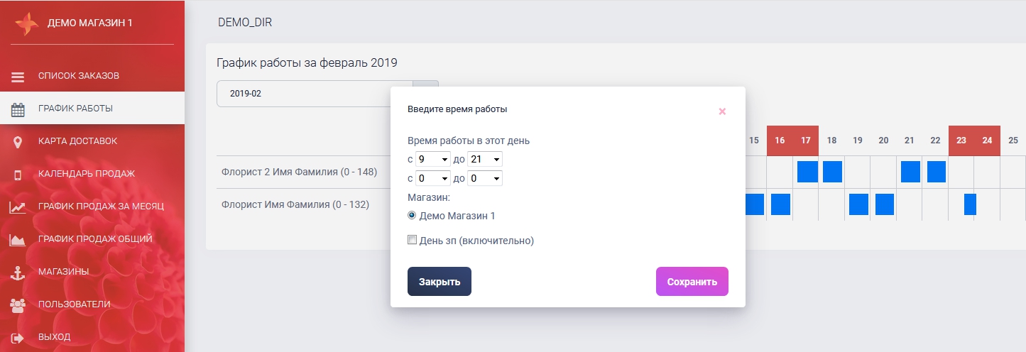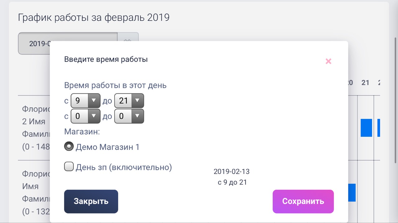 Также ве пользователи попадут в график работы и смогут проставлять себе часы работы в том или ином магазине.
