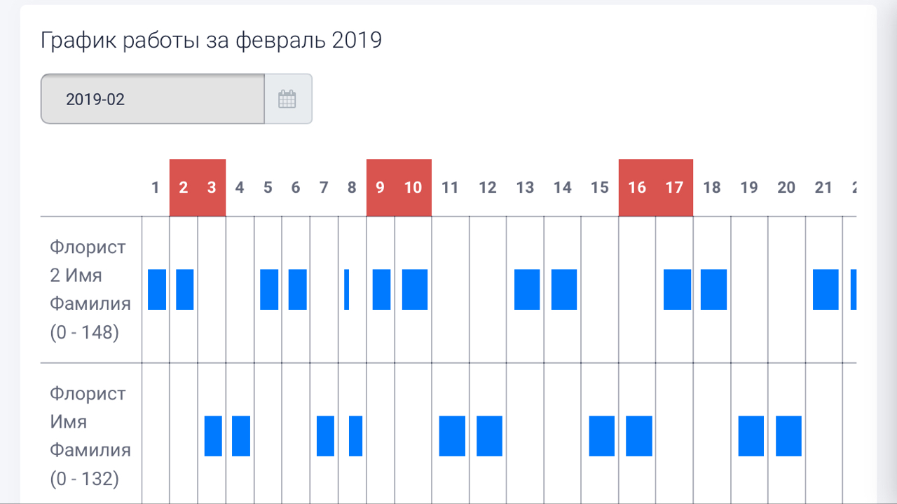 Пример заполнения графика работы 2х флористов по сменам 2 через 2 с 9 до 21 с прогнозом графика работы на будующее.