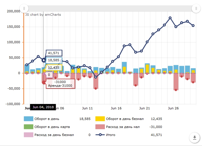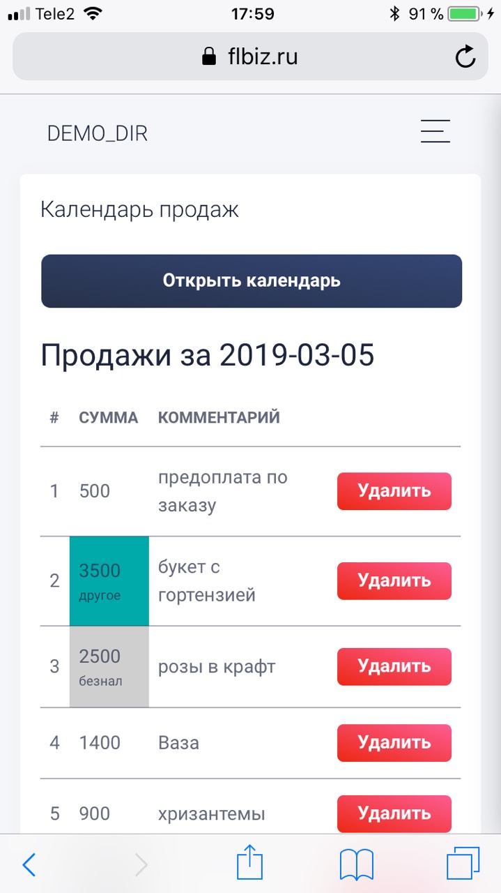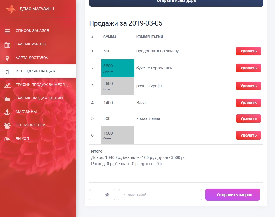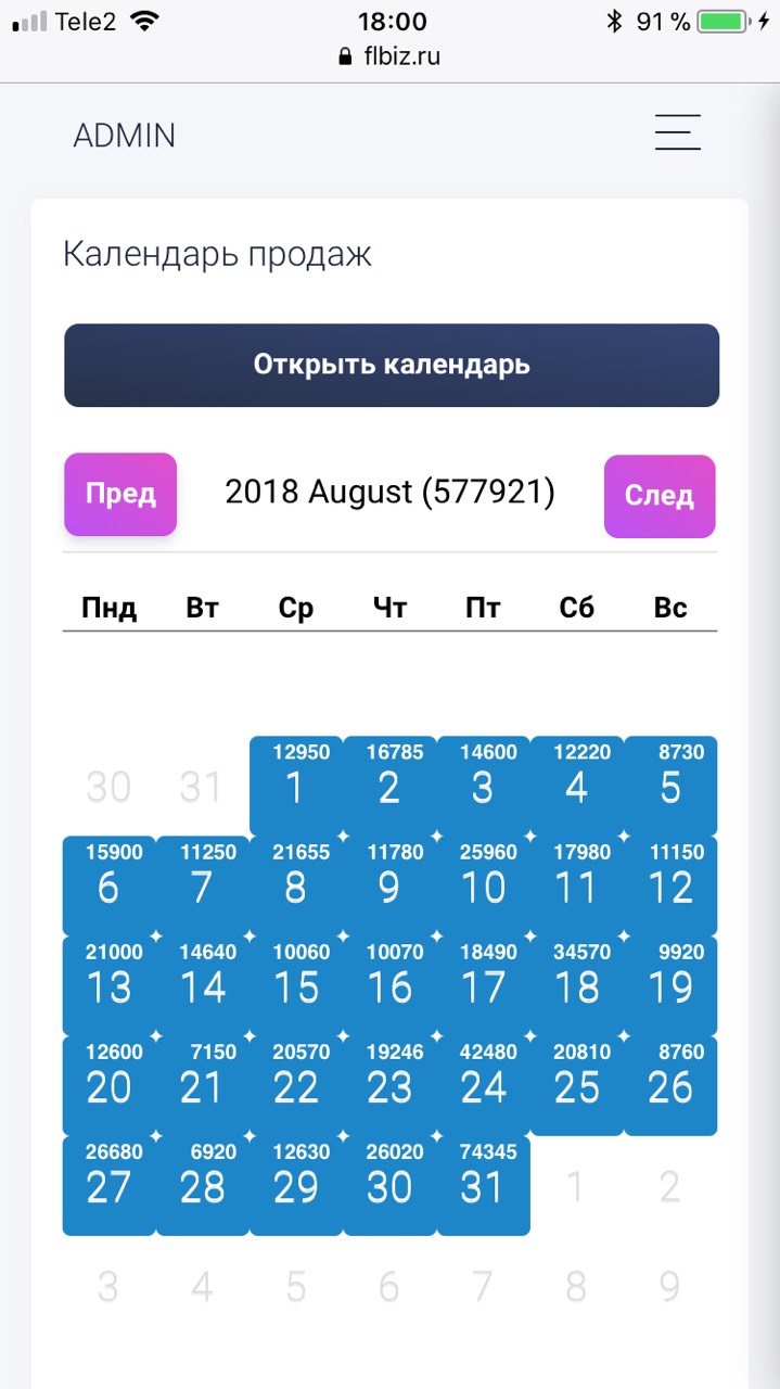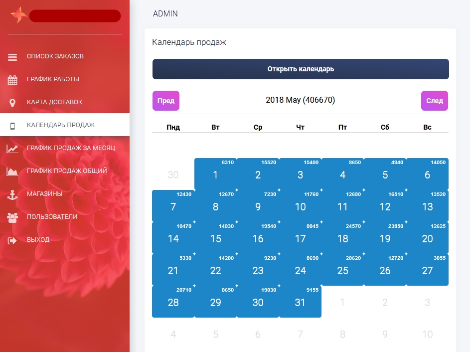Все данные сохраняются и в календаре продаж можно просмотреть продажи за любой из уже прошедших дней, также в календаре написаны суммы по дням и сумма продаж а каждый месяц.