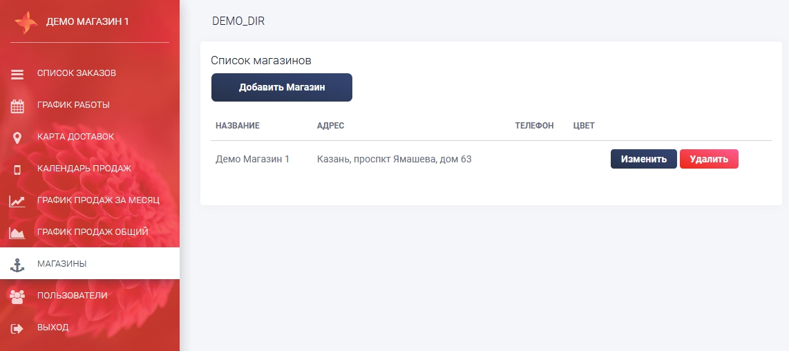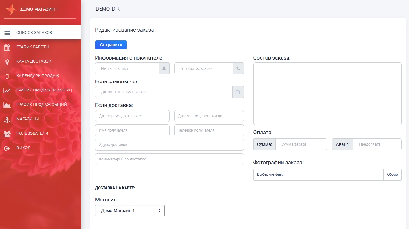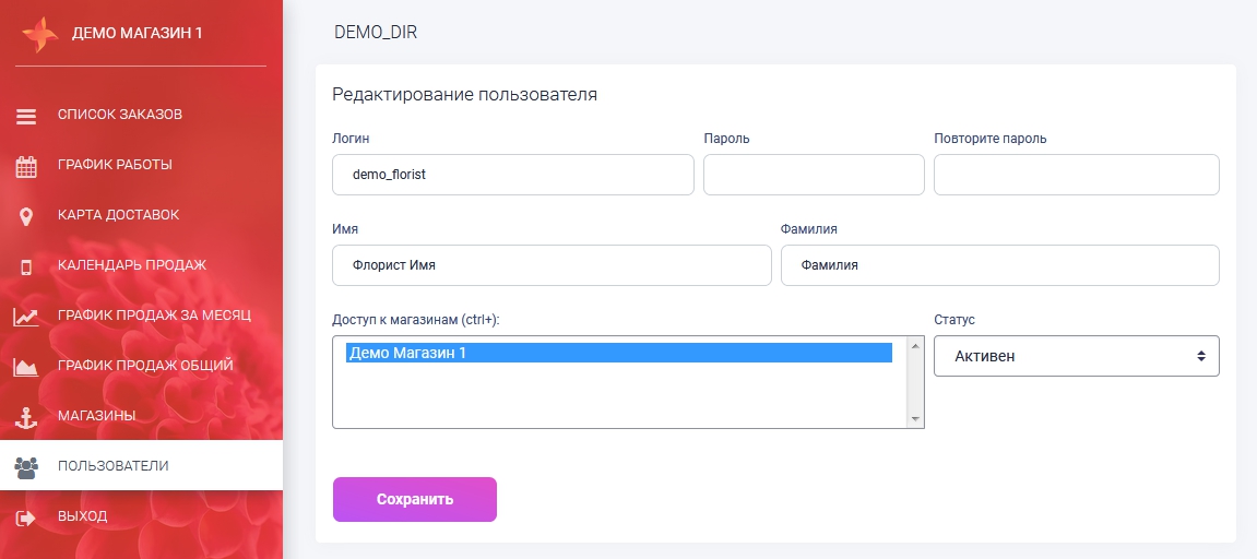 Для ознакомпления вы можете использовать данные для входа логин - demo_dir, пароль - demo_dir, если вы хотите зайти как Администратор и логин - demo_florist, пароль - demo_florist, если вы хотите зайти как Флорист.