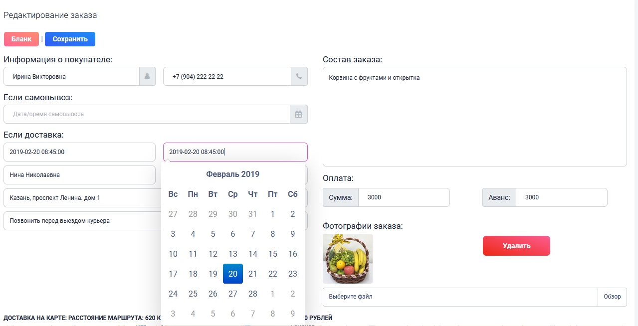 - Формироваие бланков-заказов для курьеров с данными получателя и заказа